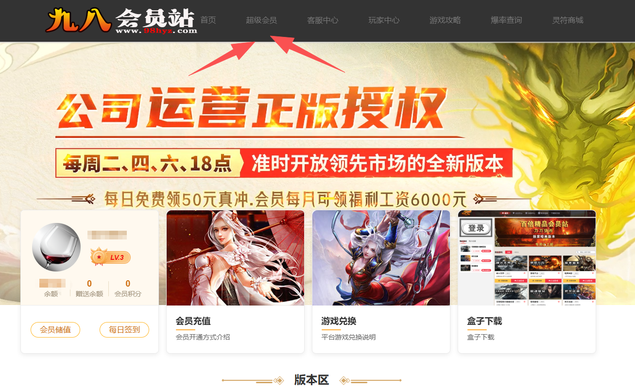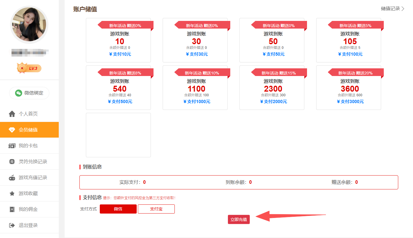 会员储值,每日签到积分,赠送余额均可充值到任意游戏中